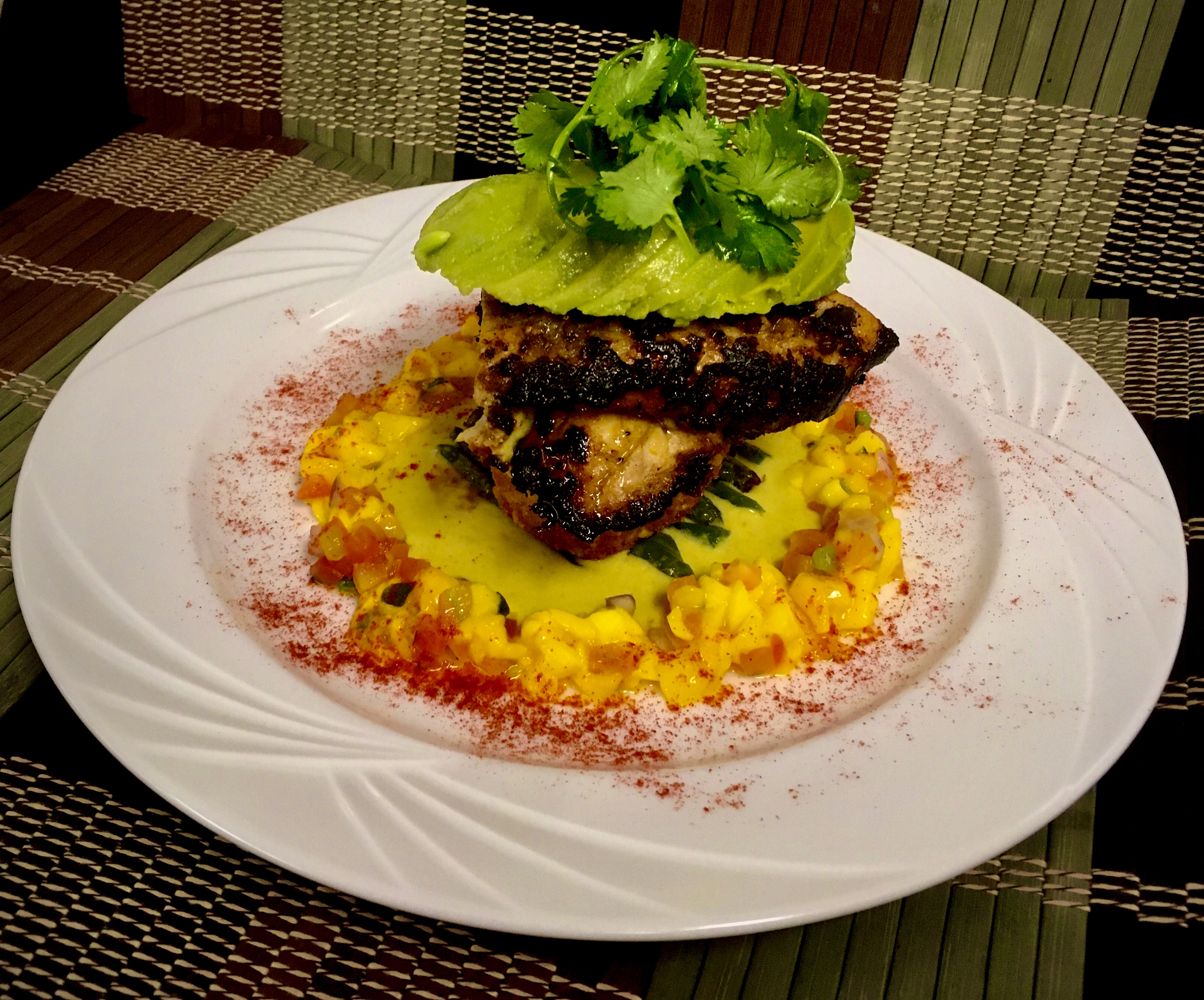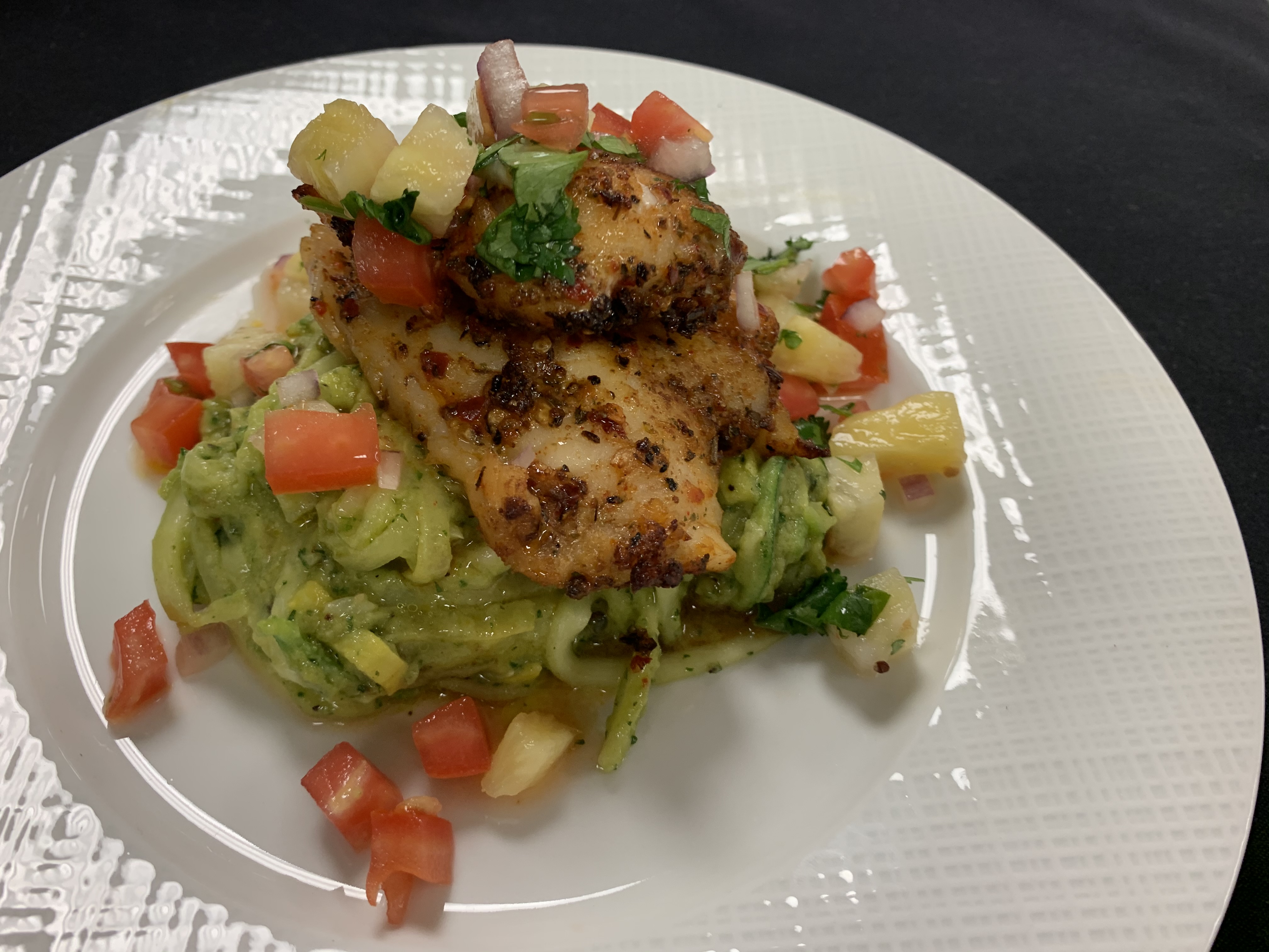 Dish Name: Blackened Grouper Filet served over Zoodles with Avocado Pesto, and Pineapple Citrus Salsa