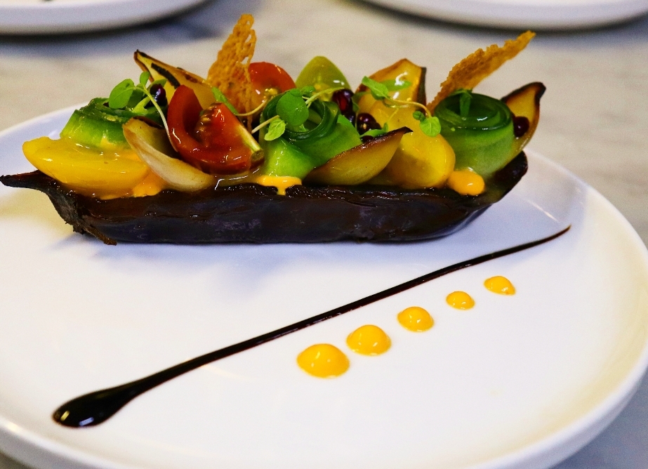 Dish Name: Grilled Eggplant, Roasted Red Repper Yoghurt and Heirloom Tomato-Cucumber Salad