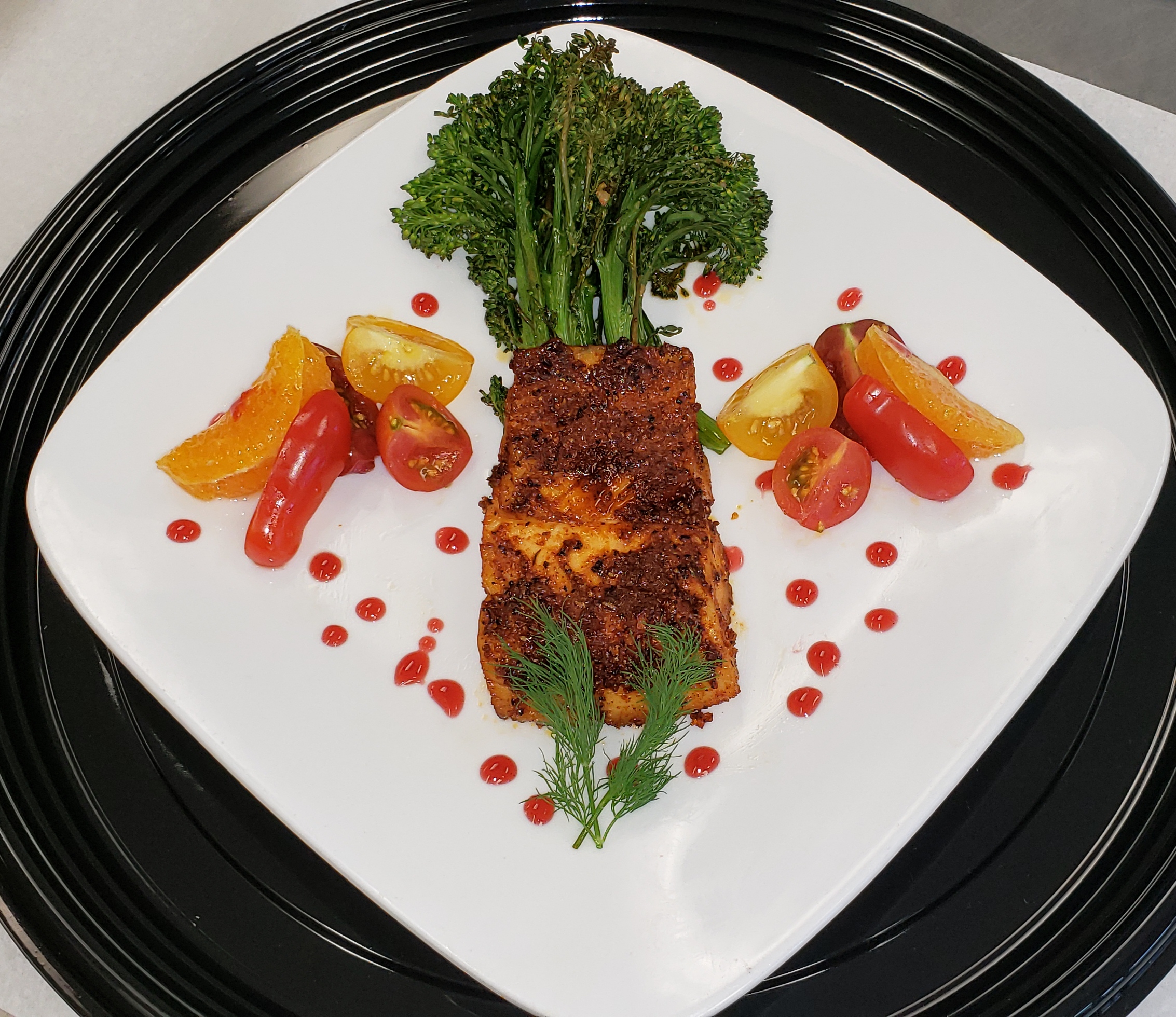 Dish Name: Sweet & Spicy Grouper w/ Roasted Broccolini, Heirloom Tomatoes, Oranges, & Raspberry Plum Drizzle